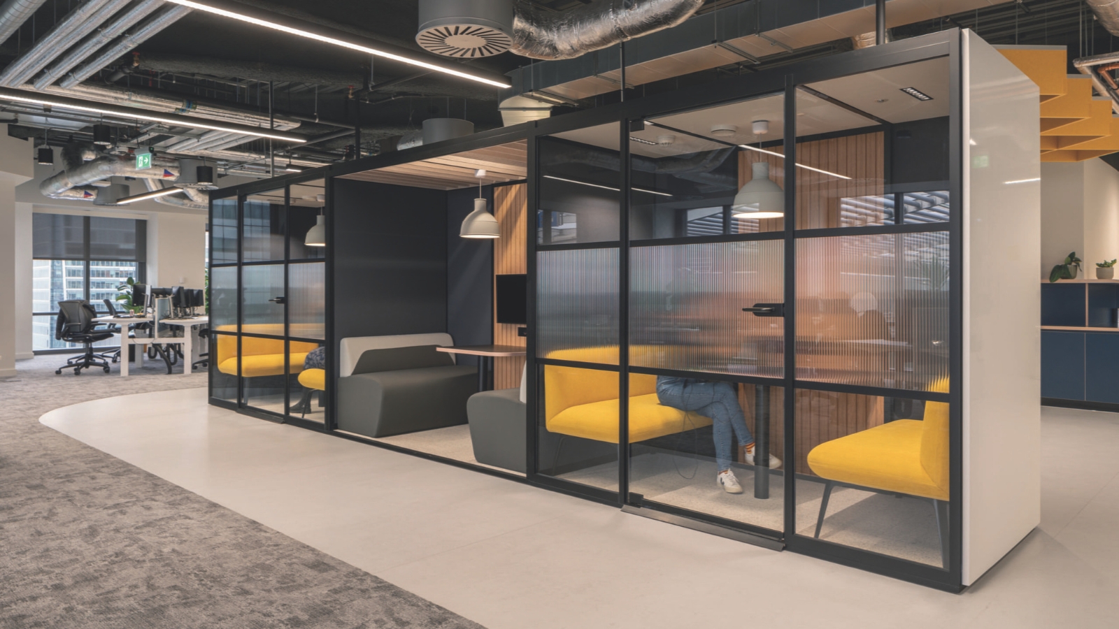 Modular pods designed for commercial environments, offering private meeting spaces with integrated lighting and ventilation.